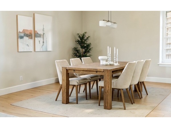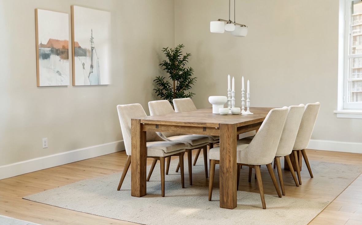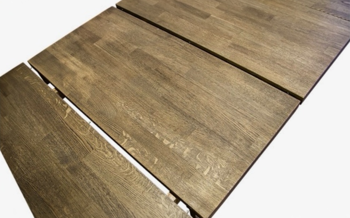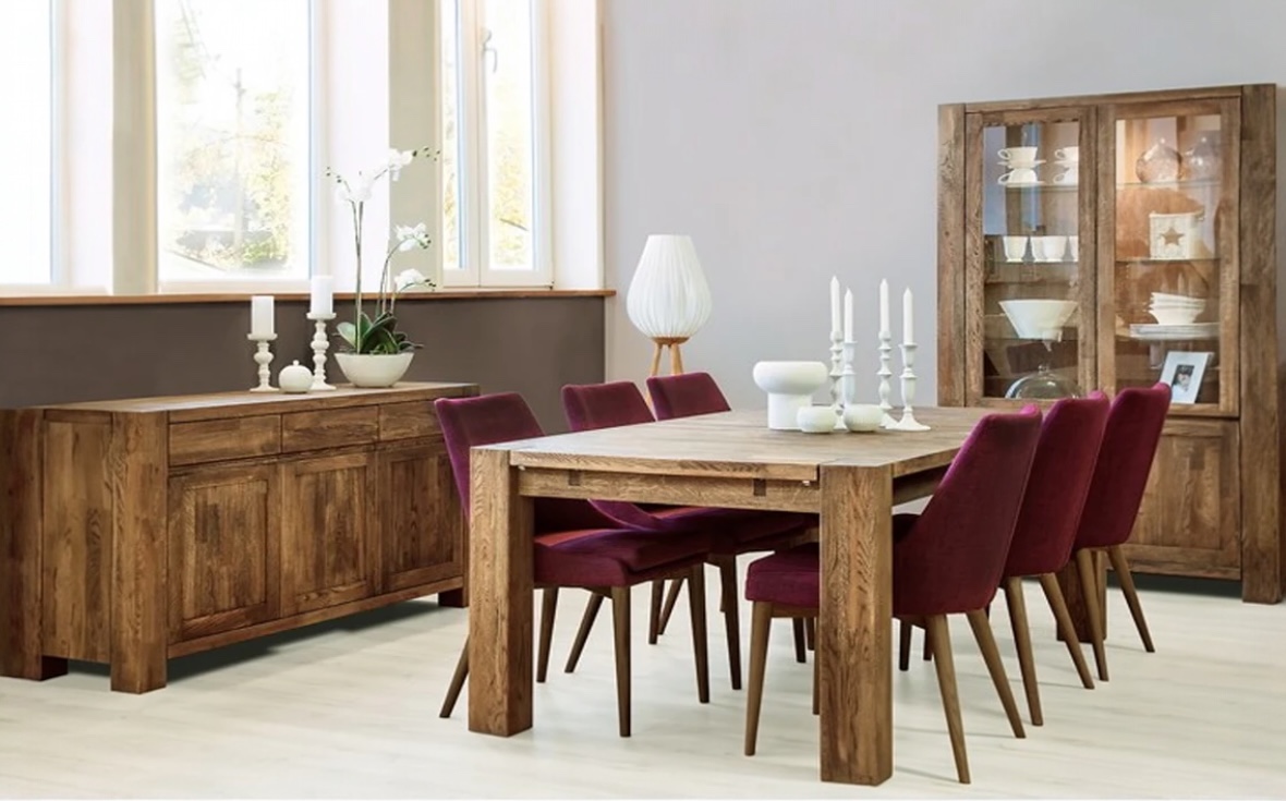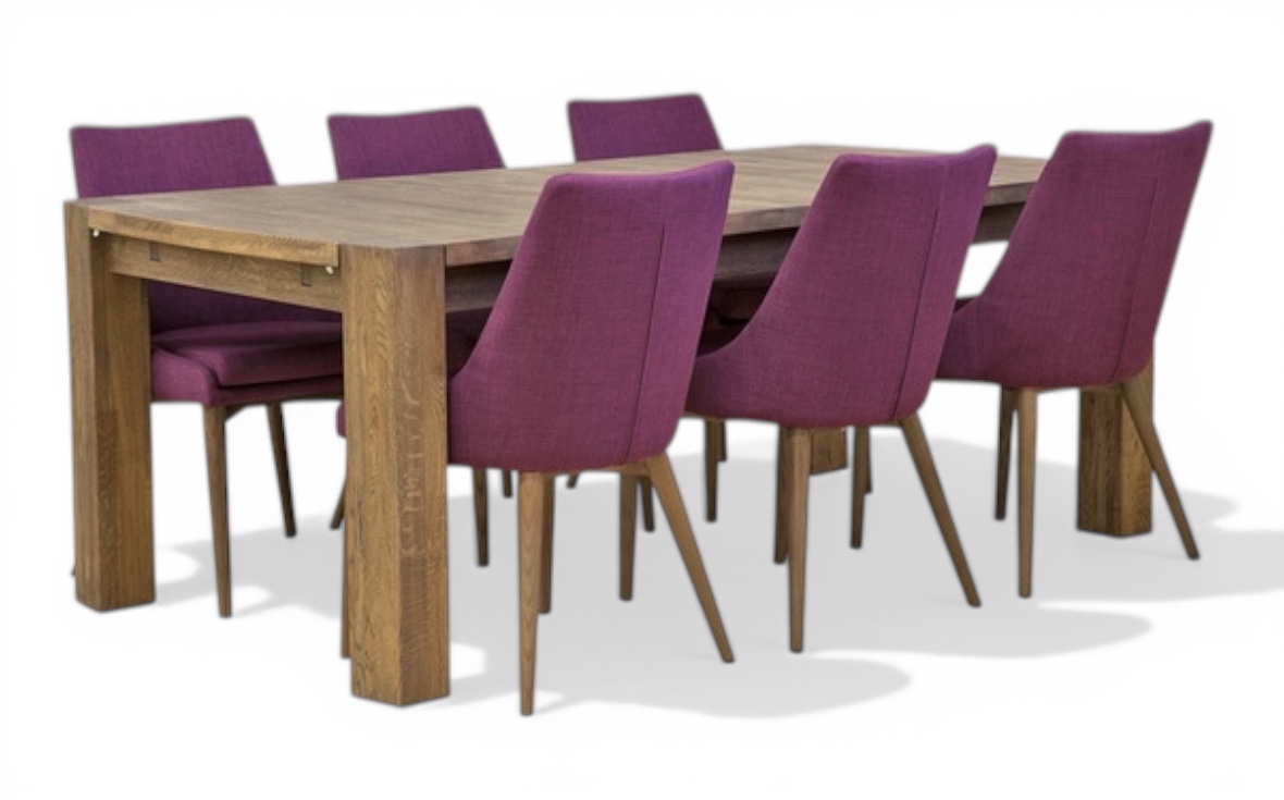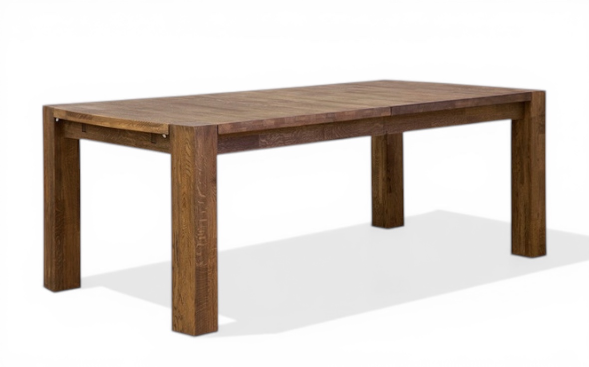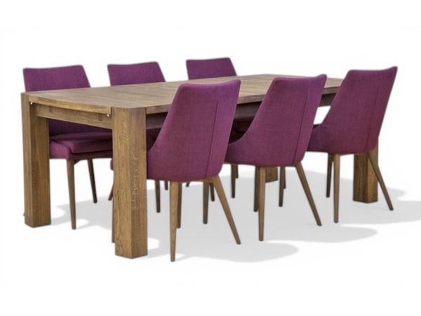 Den vackra rökta eken bidrar till en varm och inbjudande känsla, och den massiva bordsskivan kan förlängas upp till fem meter med hjälp av iläggsskivor och klaffar.