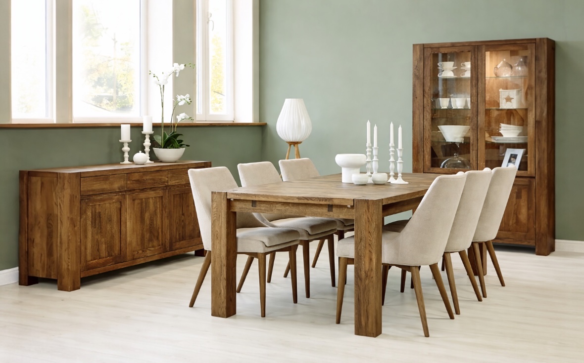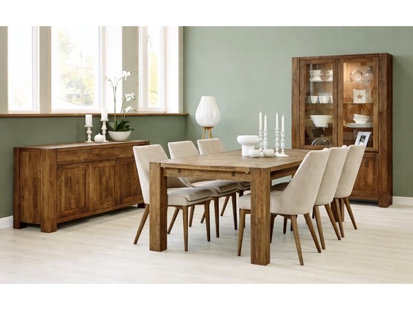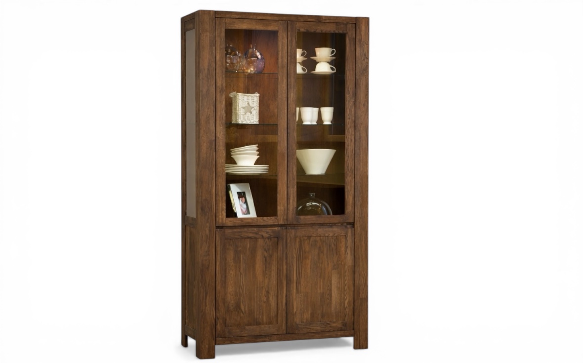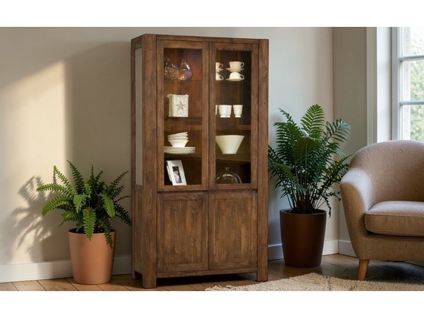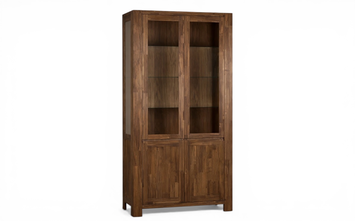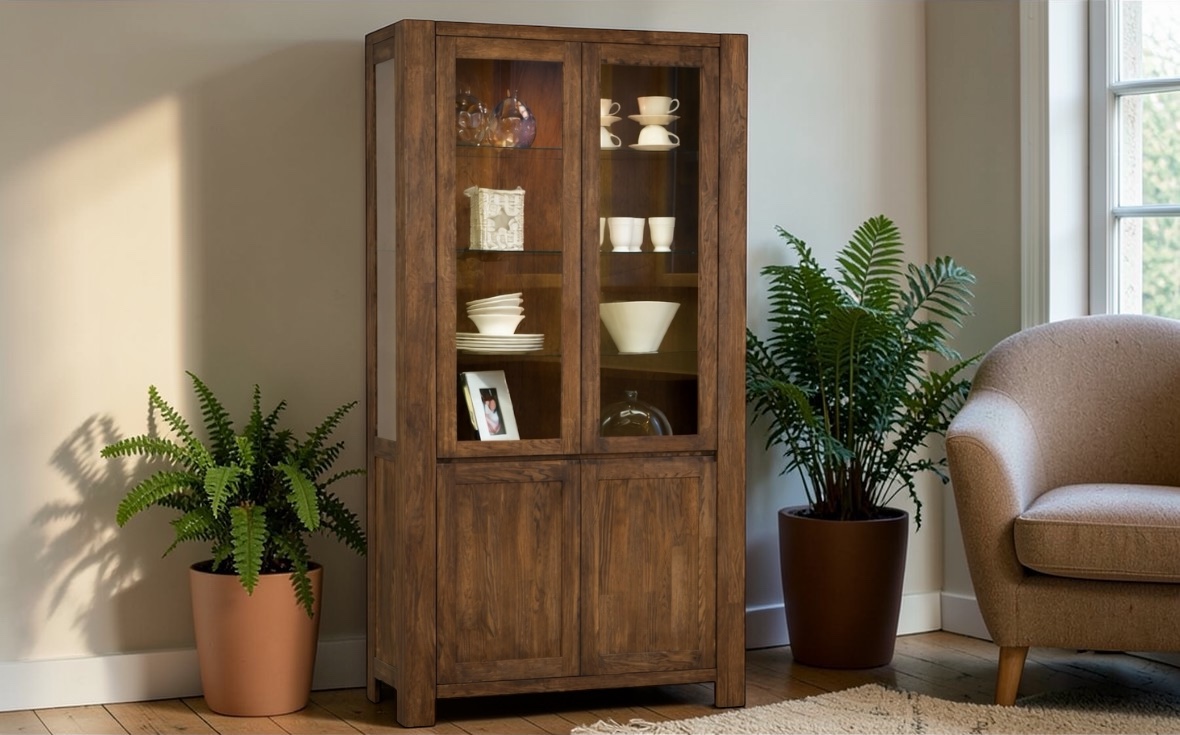Balder vitrinskåp är ett rustikt och gediget skåp i massiv rökt ek, där naturlig skönhet möter tidlös design och skapar en varm och exklusiv känsla i hemmet.