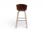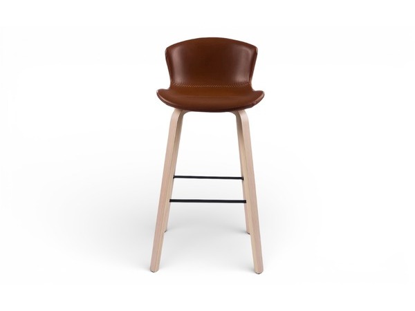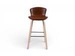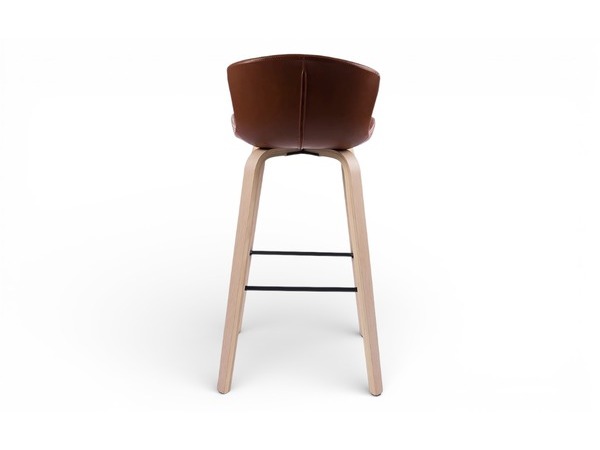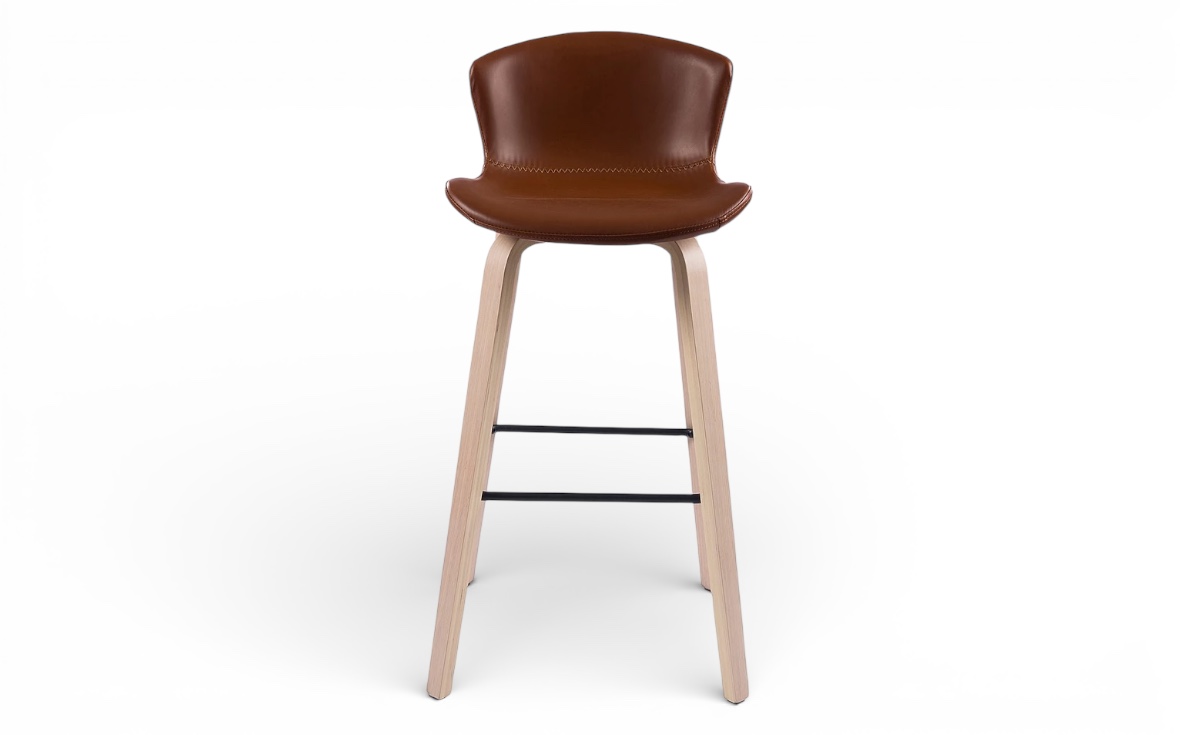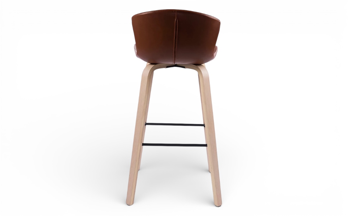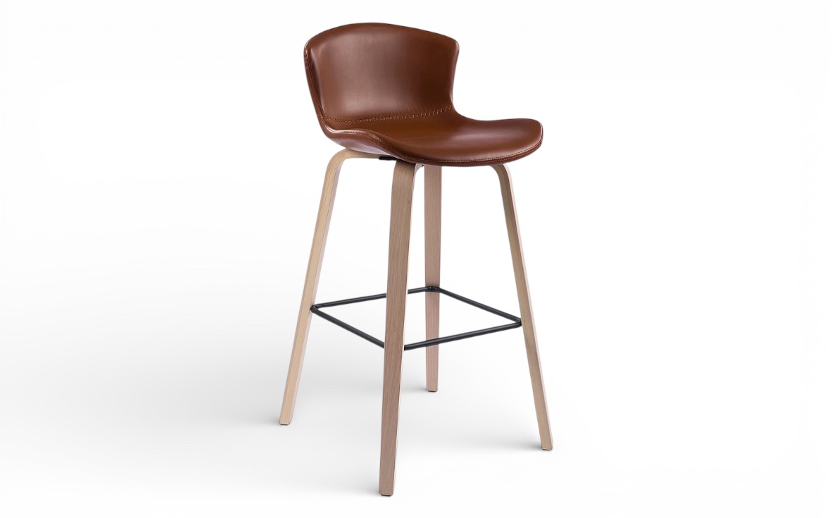 Barstolen klädd i brun konstläder med ben i vitpigmenterade lackade träben, finns även i svart ekben och sitsen klädd i svart konstläder.