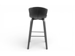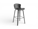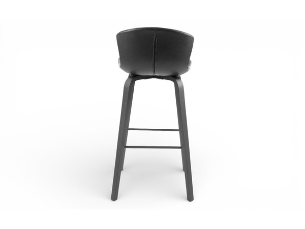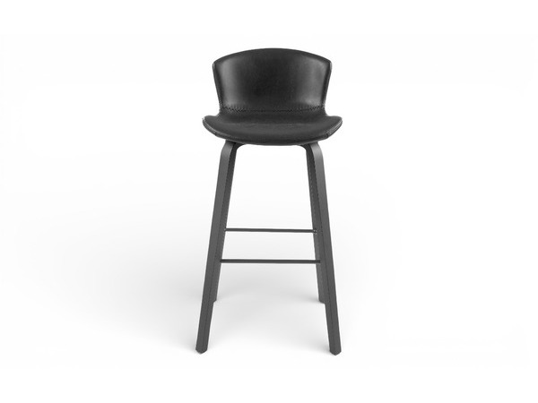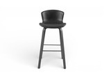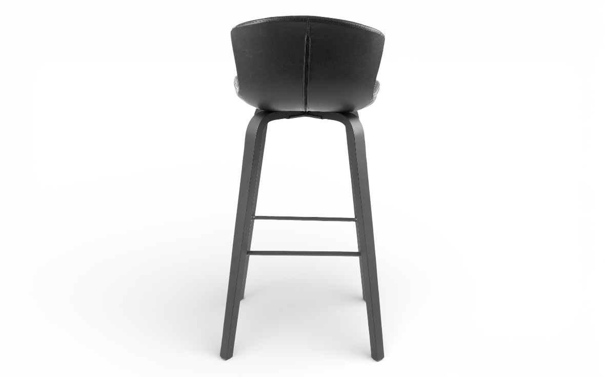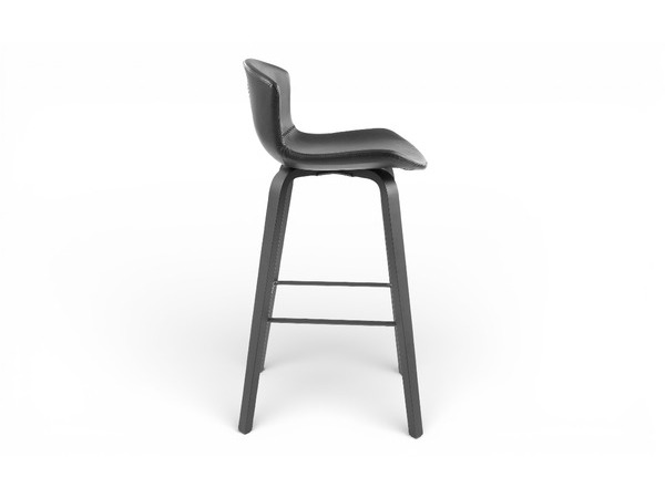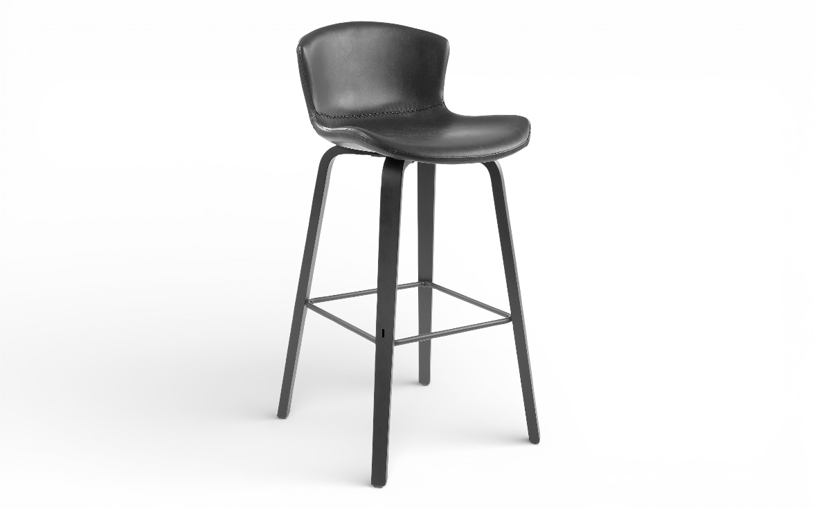 Barstolen klädd i svart konstläder med ben i svartlackad plywood, finns även i vitpigmenterade lackade ekben och en sits klädd i brunt konstläder.
