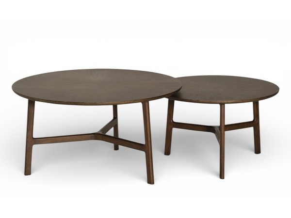 Elegant soffbord i stjärnmönstrad fanér med ben i massivt trä. Finns i två storlekar där det mindre smidigt skjuts in under det större bordet, perfekt för flexibel och stilren inredning.