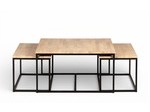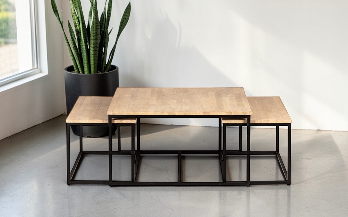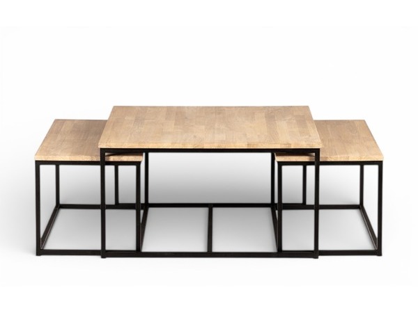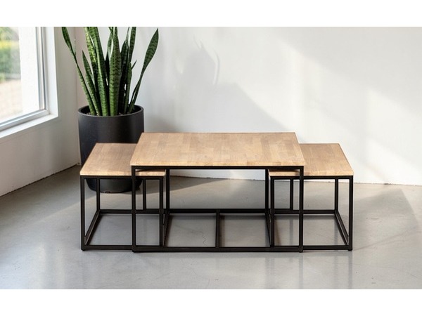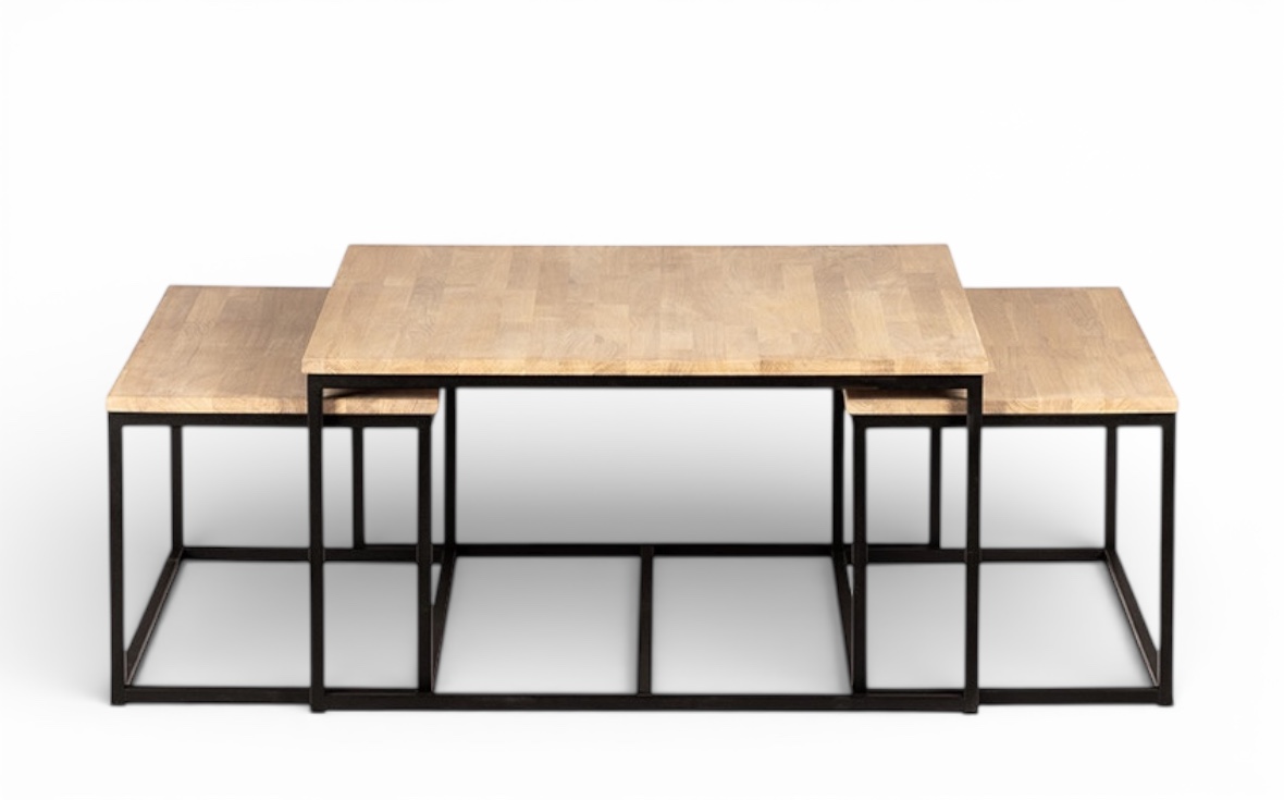 Det större bordet mäter 90 × 90 × 48 cm, medan de två mindre borden har måtten 84 × 44 × 43 cm.