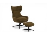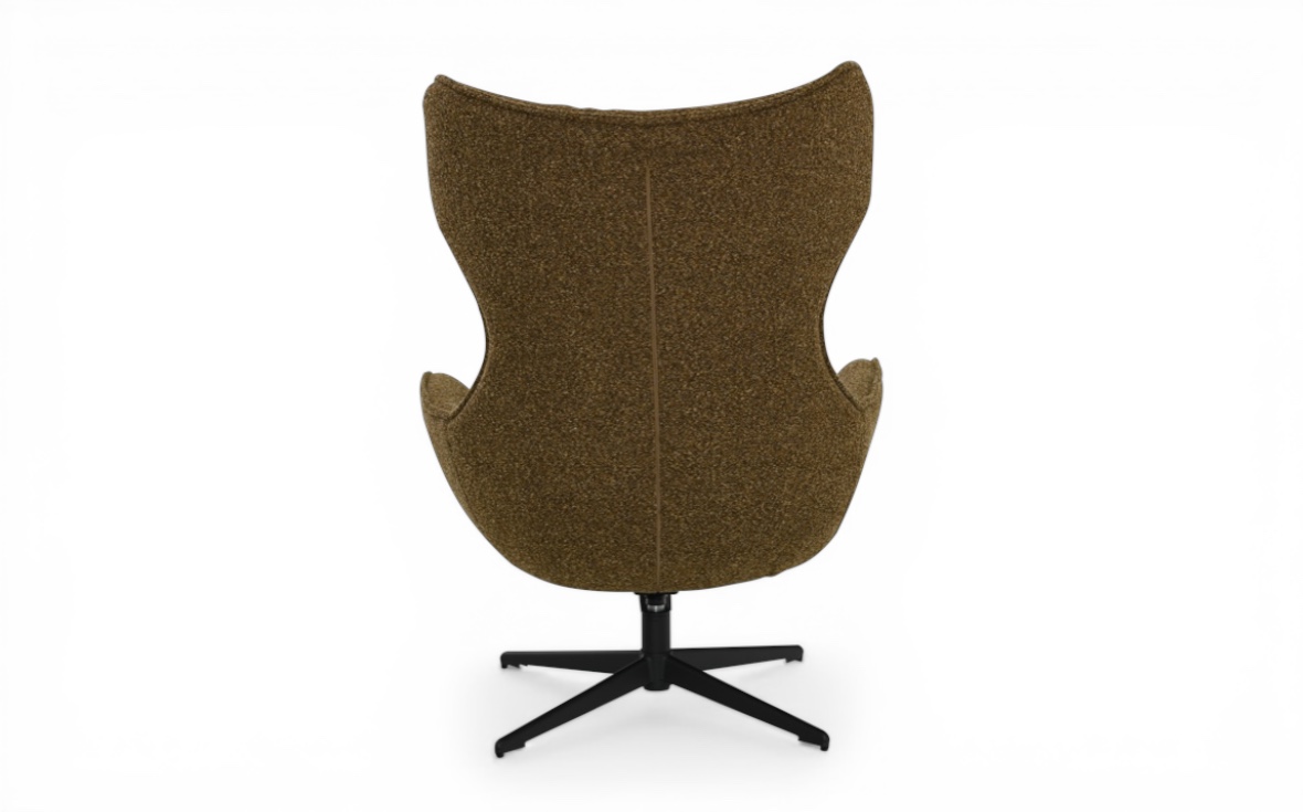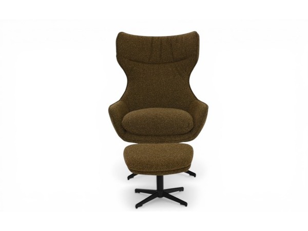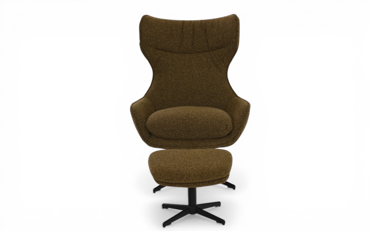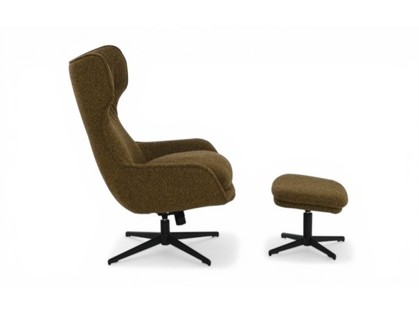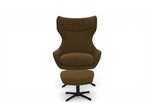 Modern snurrfåtölj med matchande pall. Fåtöljen har högt ryggstöd och justerbar lutning för optimal komfort och ergonomi. Klädd i ett strukturerat brunt tyg som ger ett varmt, elegant intryck.