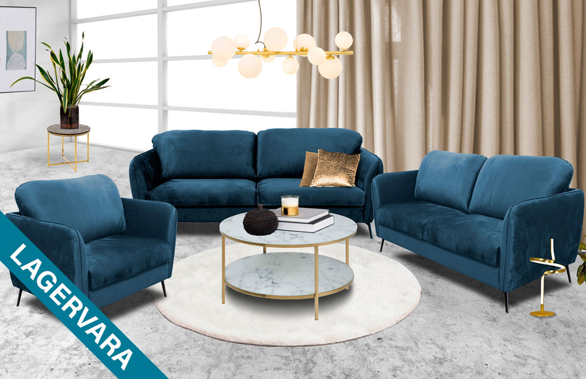 Modern och stilig soffgrupp i härligt mjuk sammet. I soffgruppen ingår en 3- sitssoffa, en 2-sitssoffa och en fåtölj. Med sin klassisk design och behagliga former skapar Sky-serien ett härligt och inbjudande intryck i hemmet.